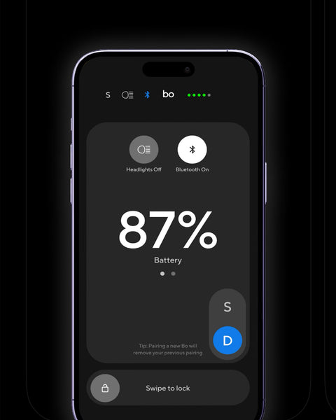 Motor immobiliser for security, speed and battery read out when riding - plus power mode switch and lighting control. Elegant, intuitive app interface.