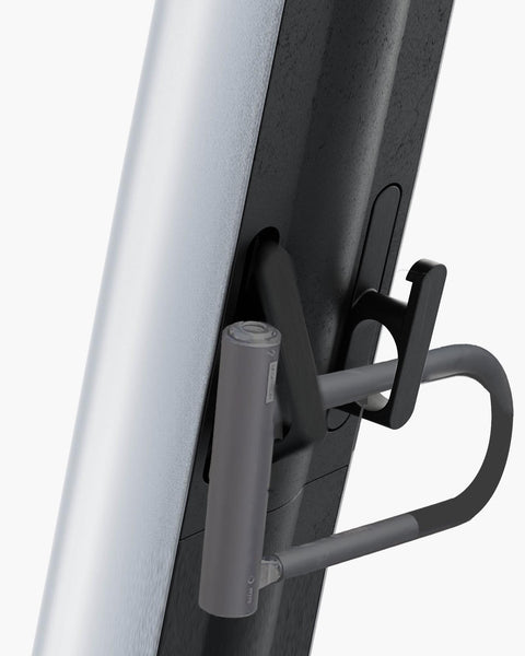 Peace of mind when leaving your Bo. Twin forged metal lock hooks positioned at railing-height, accept up to 24mm lock diameter. Bo Lock n Load.