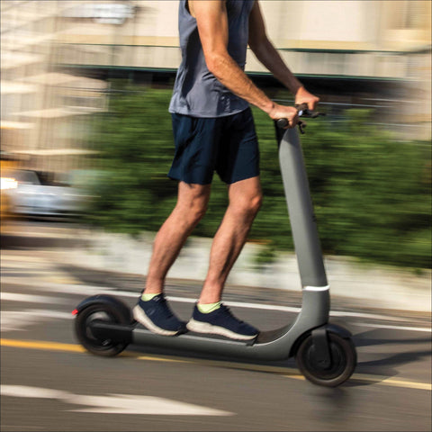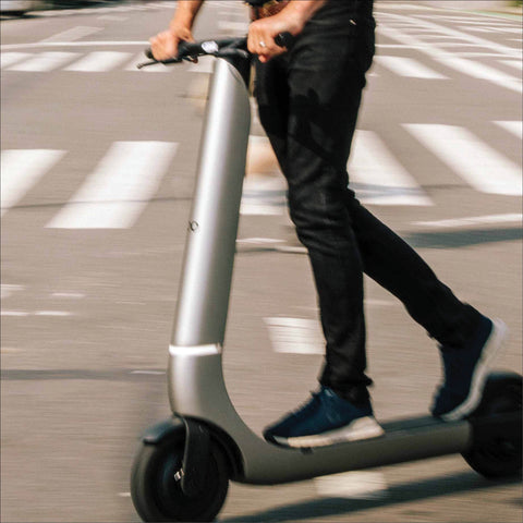 Person riding an electric scooter on a city street with buildings and traffic in the background